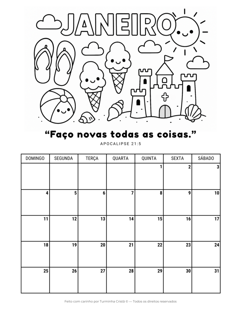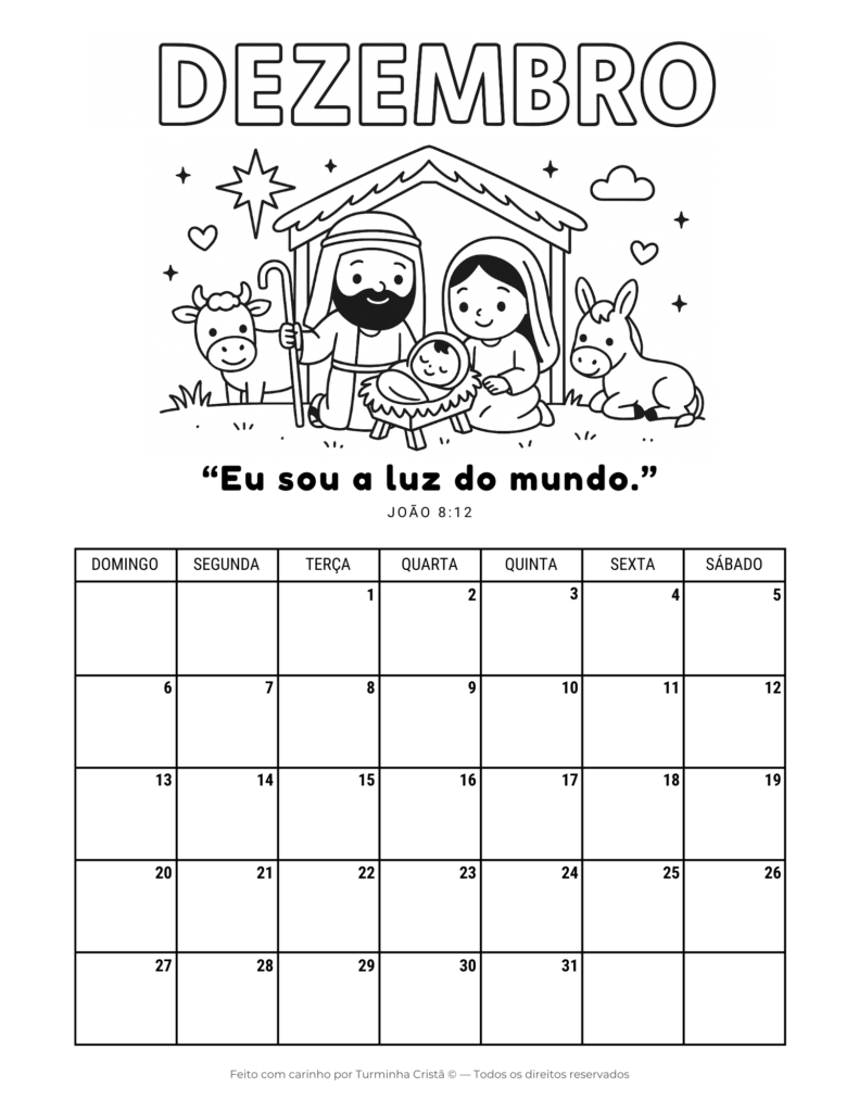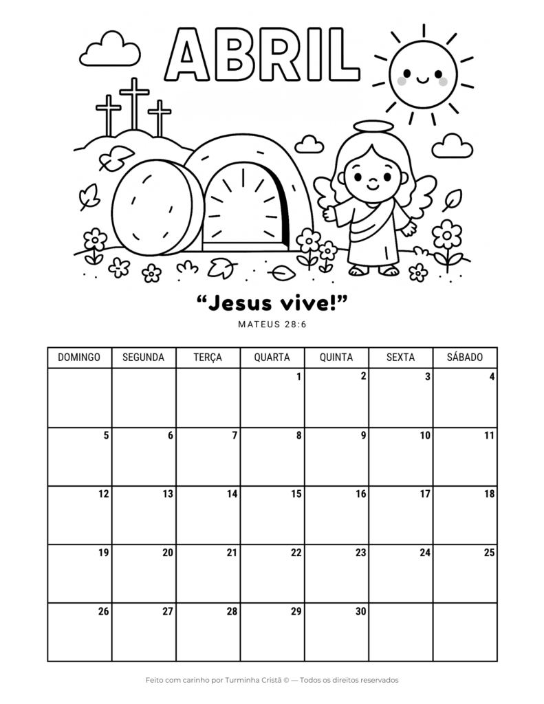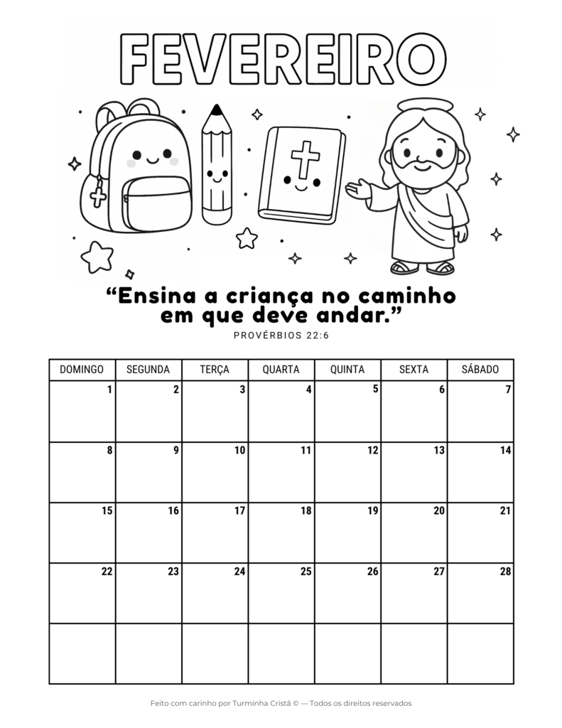 O Calendário Cristão 2026 para imprimir grátis é um material infantil criado para ajudar crianças e famílias a organizarem o ano com fé e valores cristãos. Cada mês traz uma ilustração para colorir, tornando o calendário uma atividade educativa e espiritual ao mesmo tempo.