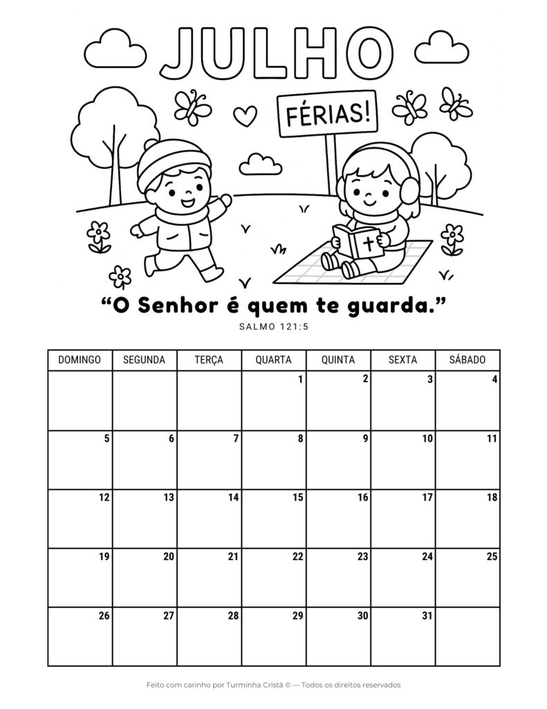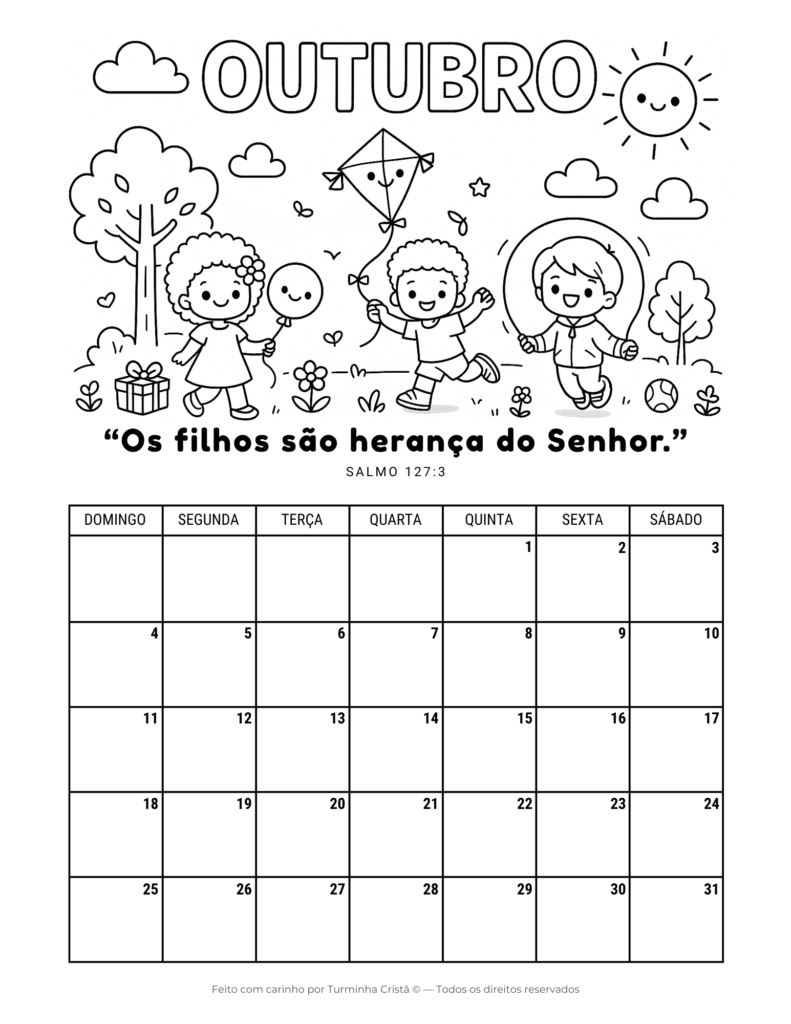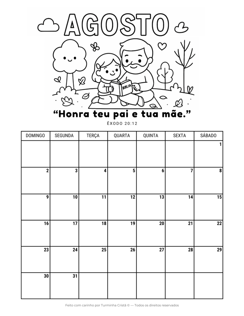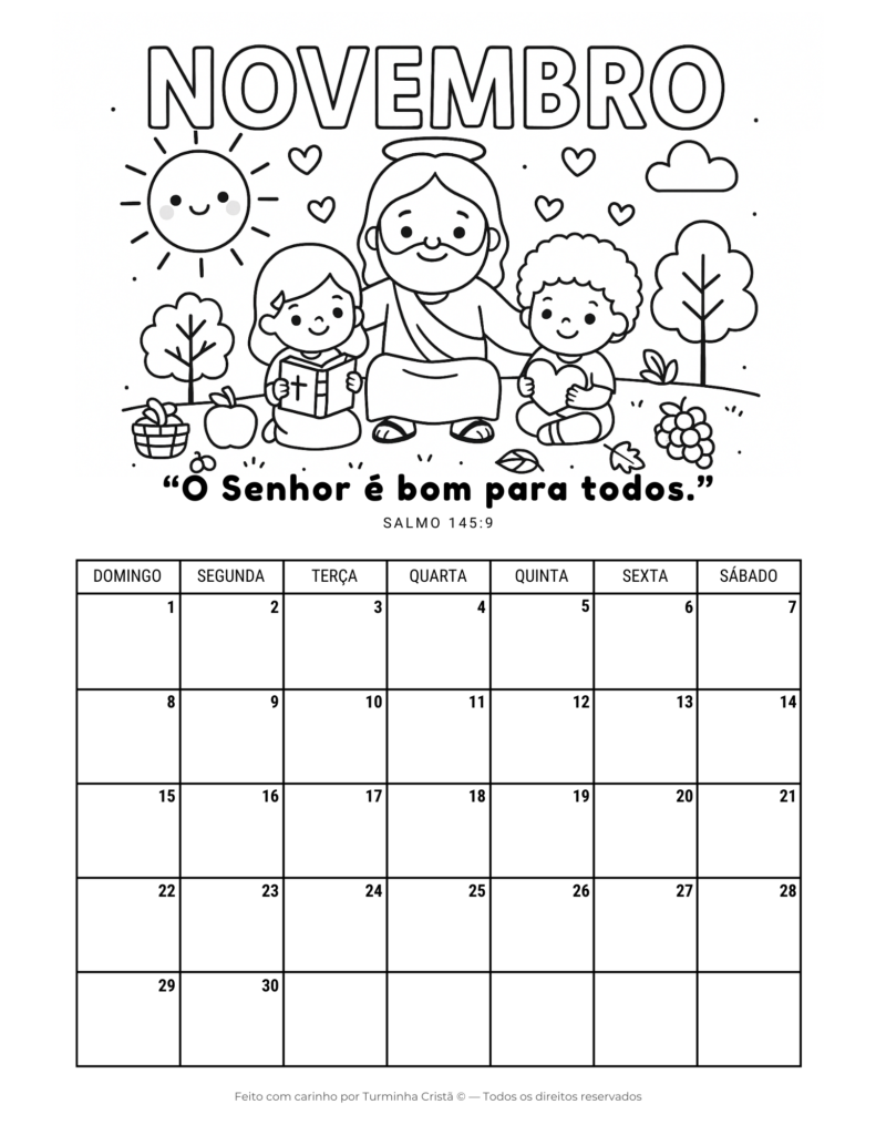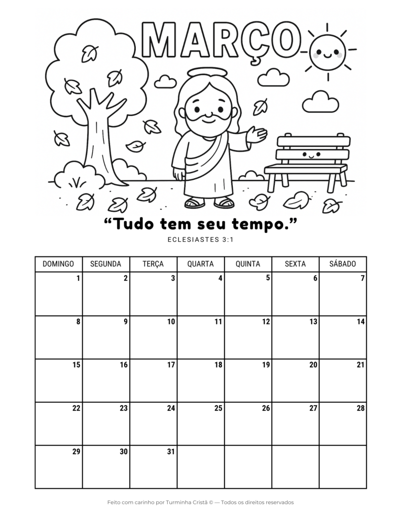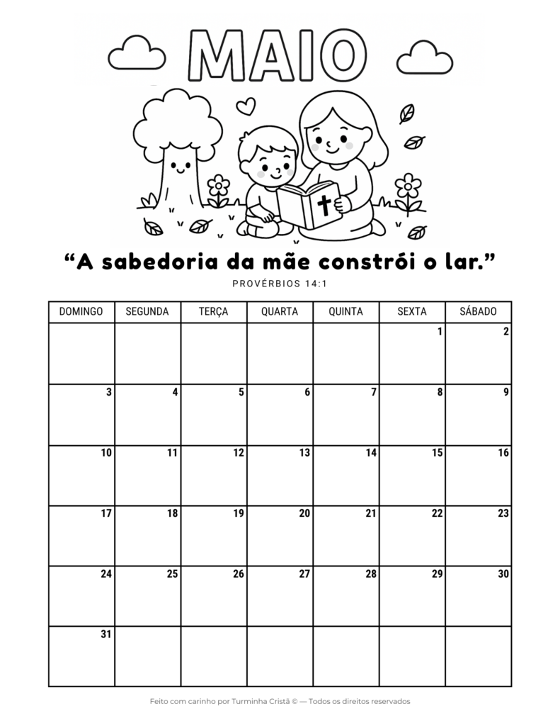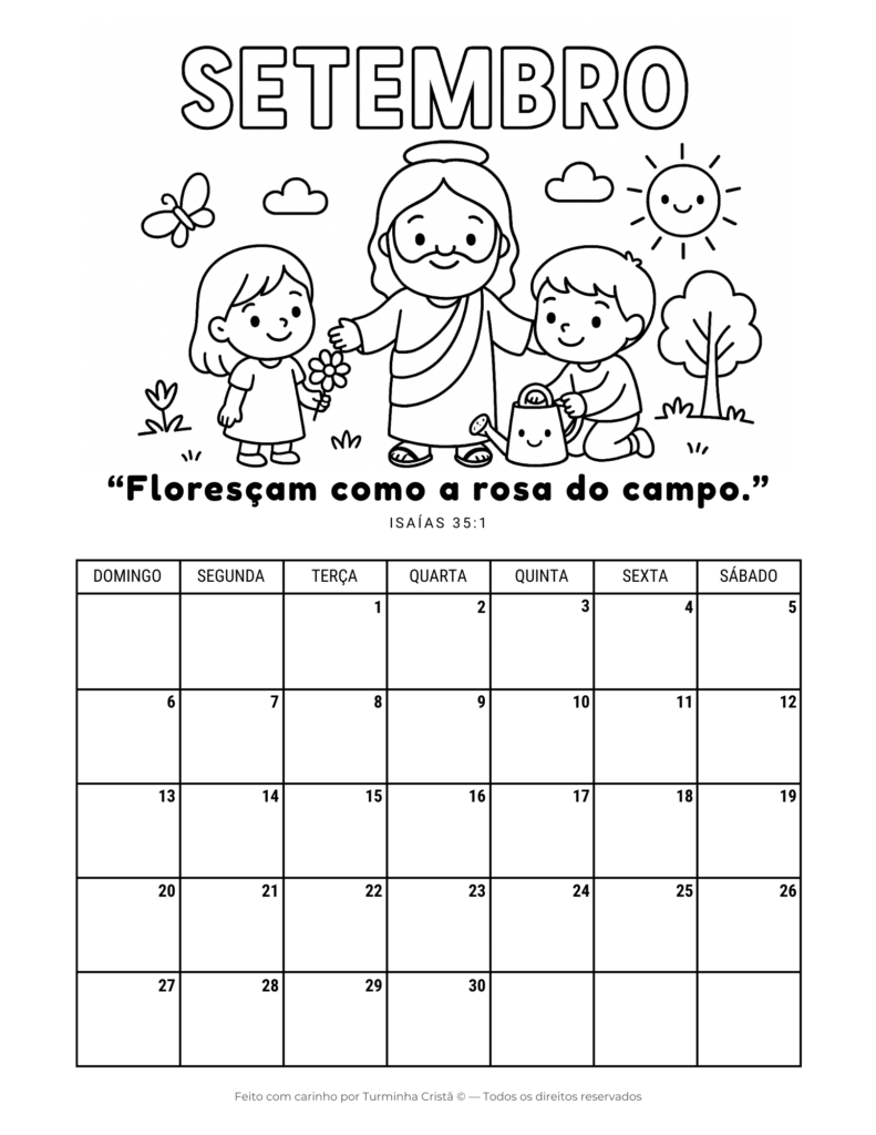 Este calendário cristão infantil é ideal para uso em casa, na escola ou na escola dominical, ajudando os pequenos a desenvolverem organização, rotina e aprendizado bíblico de forma leve e acessível.